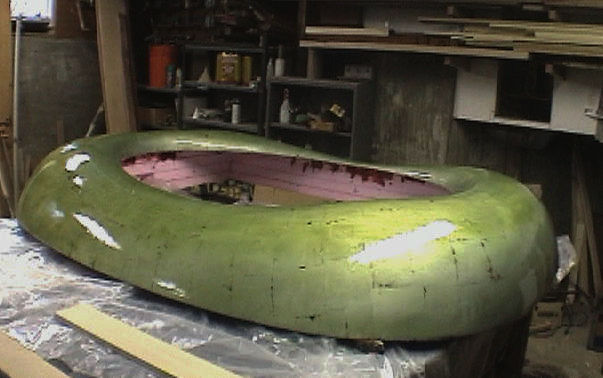 Day 4: The shape has been covered with fiberglass and red-tinted epoxy. We then hand covered the red with aluminum leaf. After this was complete, we coated the aluminum with epoxy that I had pigmented with oil paints.