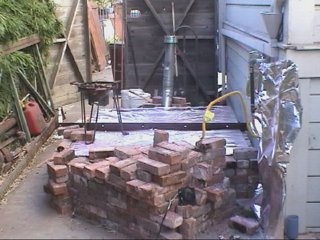 Gary built a furnace in his driveway with foundation bricks, an enormous gas burner, and foil insulation. The roof was made of concrete board. In order to make it all work we had to plumb a gas line and build a customized venturi tube to fire the gas.