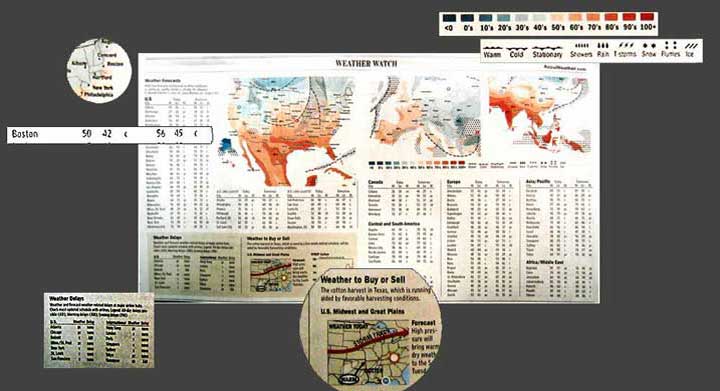 I have learned that the following ten qualities - in increasing order of importance - are integral to an effective weather map: 10. Personality. Everyone loves to hate the weather man. 9. Branding. Let 'em know who you are. 8. Stylized arrows, such as those used to represent storm fronts or wind. 7. Forecast. Do it somehow. You can look out the window and see it's raining. 6. Large amorphous patches of color should look like clouds, or other amorphous weather features. Notice the green "rain" in the doppler radar image 5. Your map should suit your audience. Notice the WSJ weather map is full of names and numbers, just like the stock pages. Channel 4 news, however, looks like Loony Toons. 4. Lots of color. Everywhere. It makes it exciting. 3. .Lines and splotches. Best to use both. Lines can represent storms, wind, roads, political boundaries. Splotches can represent weather features like temperature, rain, etc. 2. Use of color for temperature. Red=HOT and Blue=COLD. Always. 1. A recognizable map. You need to know where you're looking at.